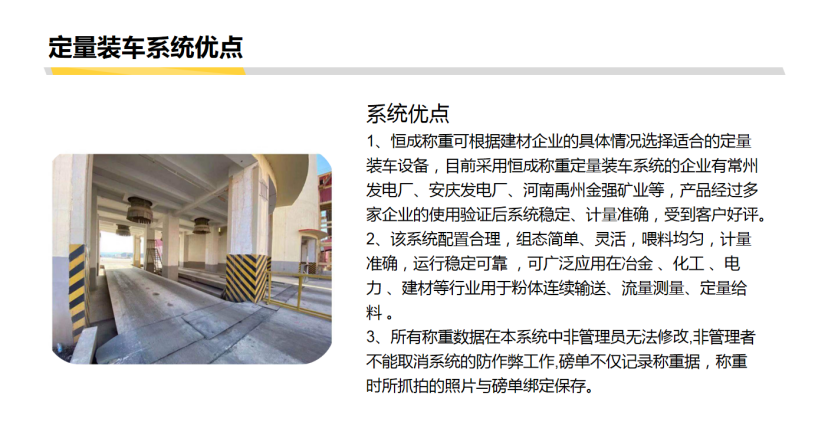 恒成稱重可根據(jù)企業(yè)的具體情況選擇適合的定量裝車設(shè)備,目前采用恒成稱重定量裝車系統(tǒng)的企業(yè)有常州國電、華宏水泥等,產(chǎn)品經(jīng)過多家企業(yè)的使用驗證后系統(tǒng)穩(wěn)定、計量準確,受到客戶好評。